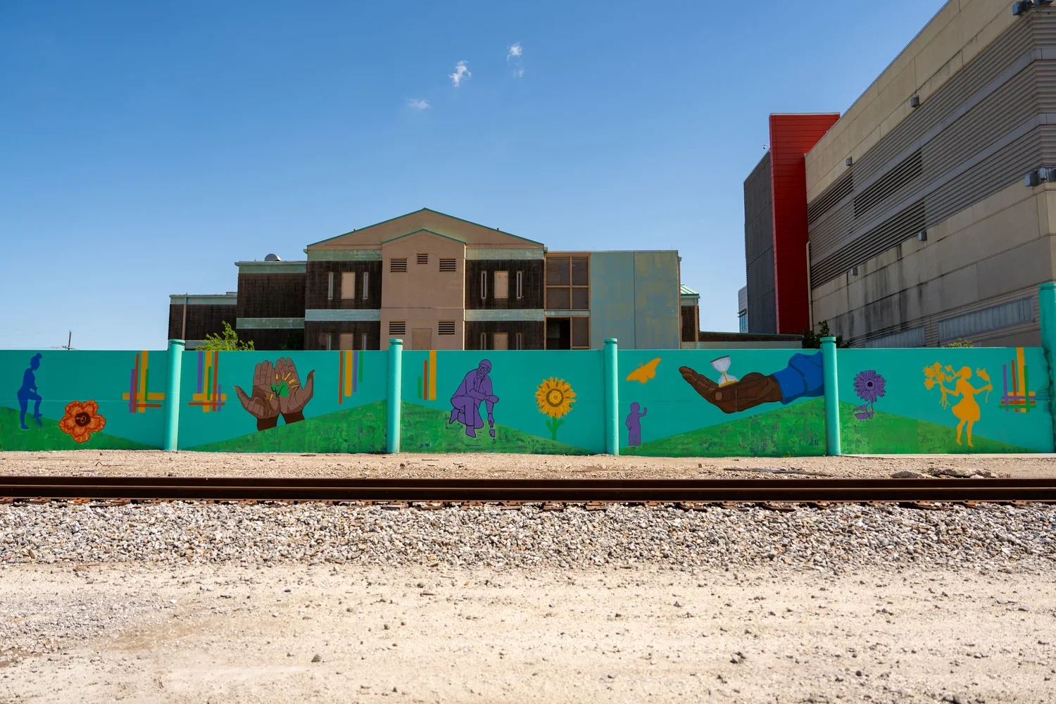 Interwoven into the piece are the stories of Mr. Henry Montgomery and Ms. Danielle Metz, both Louisiana natives whose combined sentences total 80 years. Ms. Metz’s image boldly stands in full color among the vibrant portraits at the heart of the garden, while Mr. Montgomery’s presence emerges from its outskirts. Surrounding him are hands modeled after our Young Artist Movement teens currently detained at the Juvenile Justice Intervention Center. These panels not only reflect the time lost and the estrangement of families through incarceration but also offer a counter-narrative—one that defies the stereotypes that deny our youth second chances.