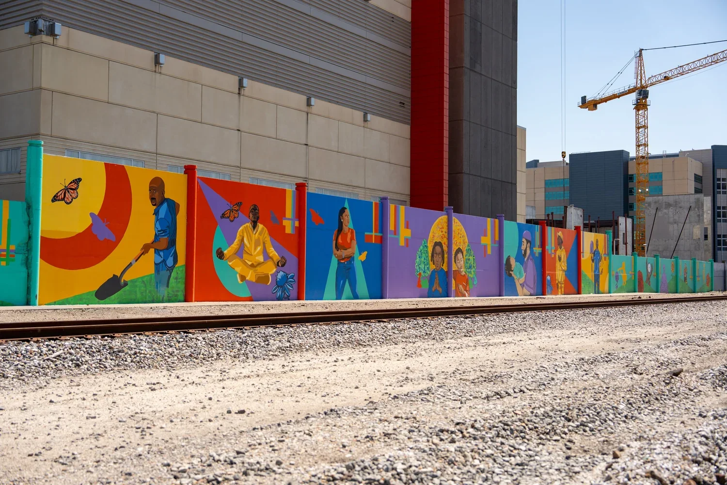 Project Description : Guardian of the Garden is set in an imaginative garden space, depicting an elder gardener who serves as the keeper of the grounds. Throughout the composition, he watches over the garden, where two young boys stand at the center, surrounded by uplifting images of Black men. Juxtaposed against the Orleans Justice Center, this work speaks to the possibilities that await our children when we nourish and nurture their needs—and the devastating outcomes if we fail to do so.